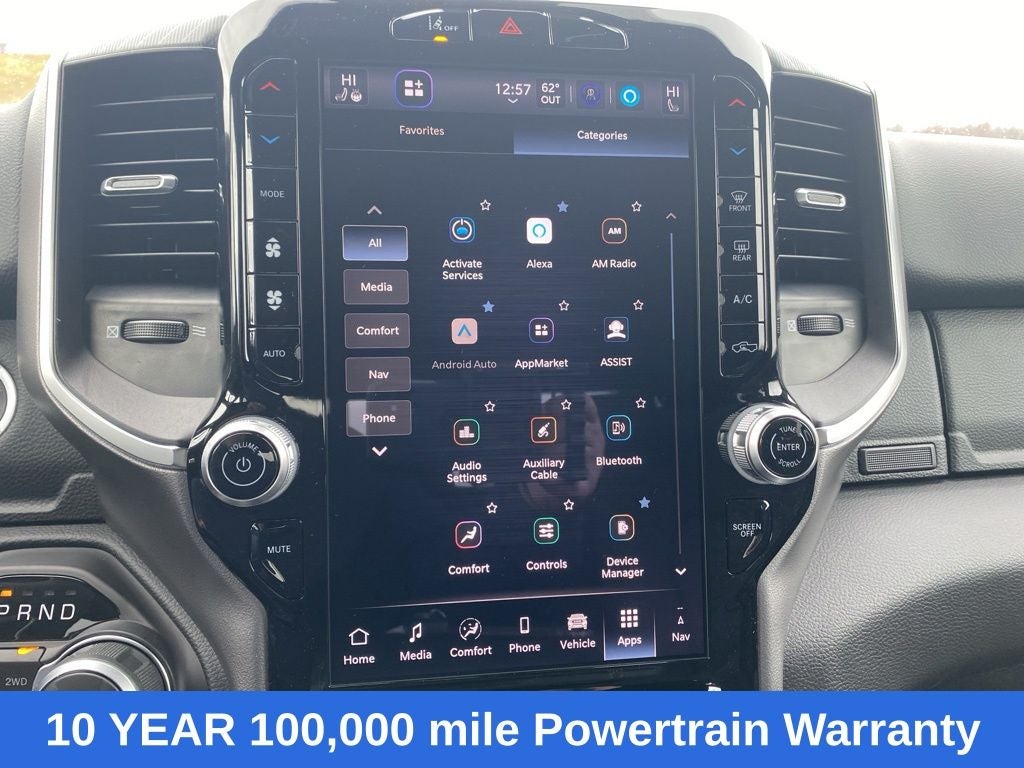 Bed Utility Group (Exterior 115V AC Outlet, MOPAR 4 Adjustable Cargo Tie-Down Hooks, MOPAR Spray in Bedliner, and Pick-Up Box Lighting), Big Horn Level 2 Equipment Group (115V Auxiliary Power Outlet, 115V Auxiliary Rear Power Outlet, 12 Touchscreen Display, 2nd Row in Floor Storage Bins, 3 Rear Seat Head Restraints, 4 Way Front Headrests, 400W Inverter, 4G LTE Wi-Fi Hot Spot, 9 Amplified Speakers with Subwoofer, Air Conditioning ATC with Dual Zone Control, Apple CarPlay, Auto Power-Folding Mirrors, Auto-Dimming Exterior Driver Mirror, Auto-Dimming Rear-View Mirror, Black Exterior Mirrors, Black Premium Power Mirrors, Body Color Fender Flares, Bucket Seats, Center Console Parts Module, Cluster 7.0 TFT Color Display, Configurable Drive Mode, Connected Travel and Traffic Services, Connectivity - US/Canada, Convex Wide-Angle Exterior Mirror Insert, Deluxe Cloth Bucket Seats, Disassociated Touchscreen Display, Exterior Mirrors Courtesy Lamps, Exterior Mirrors with Heating Element, Exterior Mirrors with Supplemental Signals, Front Seat Back Map Pockets, Full Length Floor Console, Global Telematics Box Module, Glove Box Lamp, Google Android Auto, GPS Antenna Input, GPS Navigation, HD Radio, Heated Front Seats, Heated Steering Wheel, Integrated Center Stack Radio, Integrated Voice Command with Bluetooth®, Leather Wrapped Steering Wheel, LED Dome Lamp with on/Off Switch, LED Footwell Lighting, Manual Adjust 4-Way Front Passenger Seat, Media Hub with 2 Charge Only USBs, Overhead LED Lamps, Power 2-Way Driver Lumbar Adjust, Power Adjust 8-Way Driver Seat, Power Adjustable Pedals, Premium Overhead Console, Radio: Uconnect 5 Navigation with 12.0 Display, Rear 60/40 Folding Seat, Rear Center Armrest, Rear Power Sliding Window, Rear Window Defroster, Remote Tailgate Release, Security Alarm, SiriusXM Radio Service, SiriusXM with 360L, Steering Wheel Mounted Audio Controls, Sun Visors with Illuminated Vanity Mirrors, Universal Garage Door Opener, and USB Host Flip), Night Edition (Accent Color Door Handles, Accent Color Premium Power Mirrors, Accent Color Tailgate Handle, Anti-Spin Differential Rear Axle, Black Exterior Truck Badging, Black Headlamp Bezels, Black Interior Accents, Black Painted Exterior Mirrors Caps, Black Tail Lamp Bezels, Body Color Front Bumper, Body Color Rear Bumper with Step Pads, Dual Exhaust with Black Tips, Grille Black Surround Black Mesh, RAM Grille Badge - Black, and Wheels: 20 x 9.0 Aluminum Painted Clad), Quick Order Package 27Z Big Horn, Trailer Tow Group (Black Trailer Tow Power Mirrors, Manual Folding Exterior Mirrors, Manual Telescoping Mirrors, Mirror Clearance/Running Lights, Power-Adjustable Convex Aux Mirrors, Trailer Brake Control, Trailer Reverse Steering Control, Trailer Tire Pressure Monitoring System, and Trailer Tow Mirrors), 33 Gallon Fuel Tank, 4-Wheel Disc Brakes, 48V Belt Starter Generator, 6 Speakers, ABS brakes, Air Conditioning, Alloy wheels, AM/FM radio, Apple CarPlay/Android Auto, Auto High-beam Headlights, Brake assist, Bumpers: chrome, Cloth Bucket Seats, Cluster 12 TFT Color Display, Compass, Delay-off headlights, Dome Dual LED Reading Lamp, Driver door bin, Dual front impact airbags, Dual front side impact airbags, Dual-Pane Panoramic Sunroof, Electronic Stability Control, Front anti-roll bar, Front Bucket Seats, Front Center Armrest w/Storage, Front fog lights, Front reading lights, Front wheel independent suspension, Fully automatic headlights, Heated door mirrors, Illuminated entry, Low tire pressure warning, Manual Adjust 4-Way Driver Seat, MOPAR Front and Rear Rubber Floor Mats, Multi-Function Tailgate, MyFlexCare Service Plan, Occupant sensing airbag, Outside temperature display, Ov Price includes: $3500 - 2026 National Retail Consumer Cash . Exp. 03/02/2026 $500 - 2026 National 2026 First Responder Bonus Cash . Exp