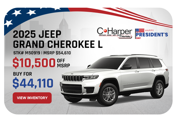 4.9% APR UP TO 72 Months on all 2025 Jeep Grand Cherokee models for well qualified buyers. Must finance through Stellantis Financial Services. Not all will qualify.No downpayment required. Not combinable with other offers. Cost per $1,000 is $16.09 for 72 months. Vehicle shown for illustrative purposes only. Multiple available. See dealer for details.